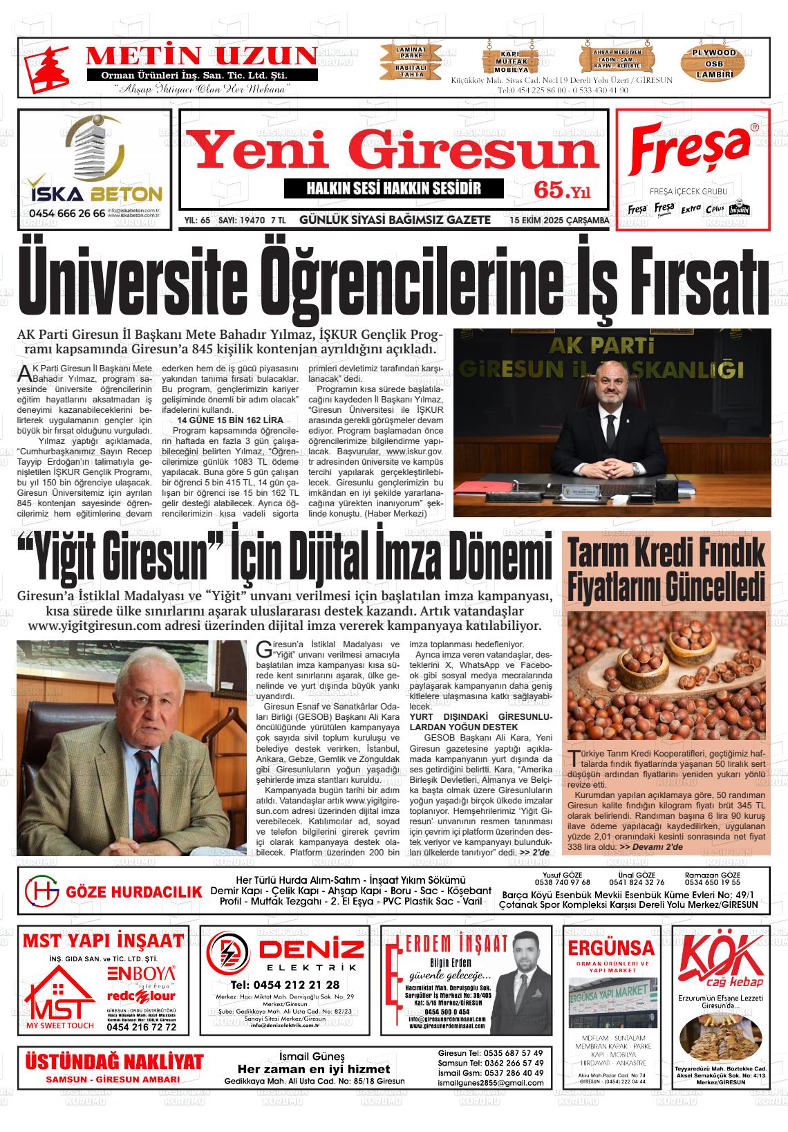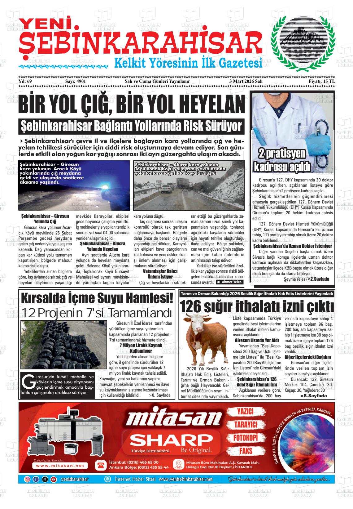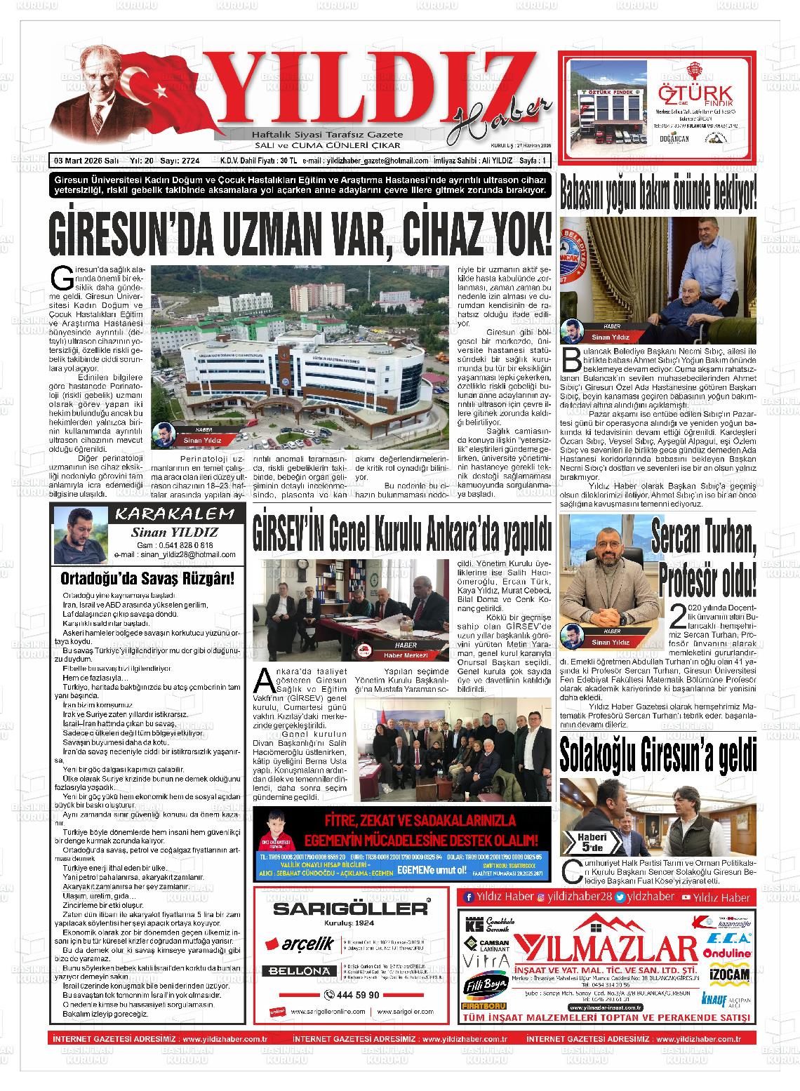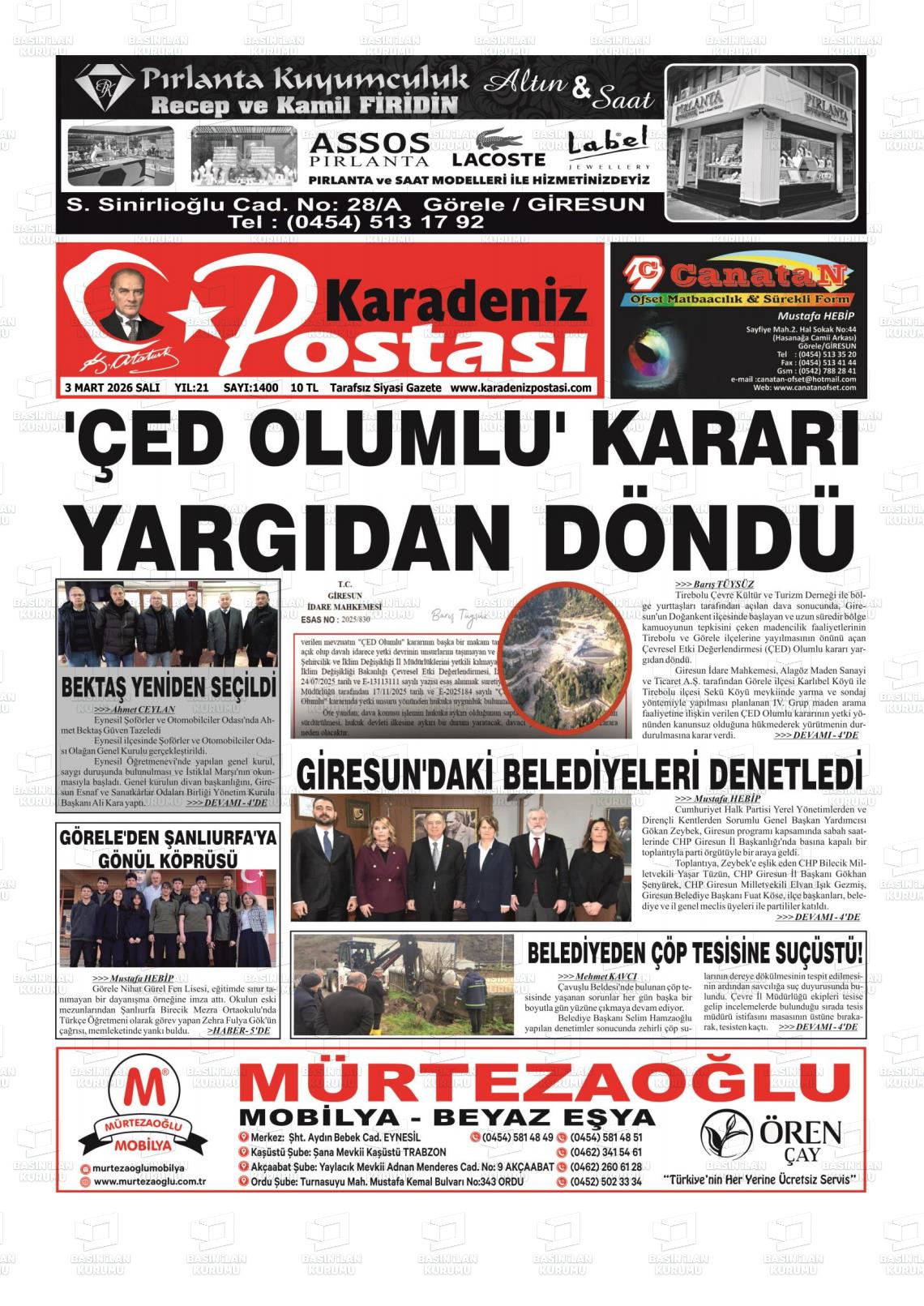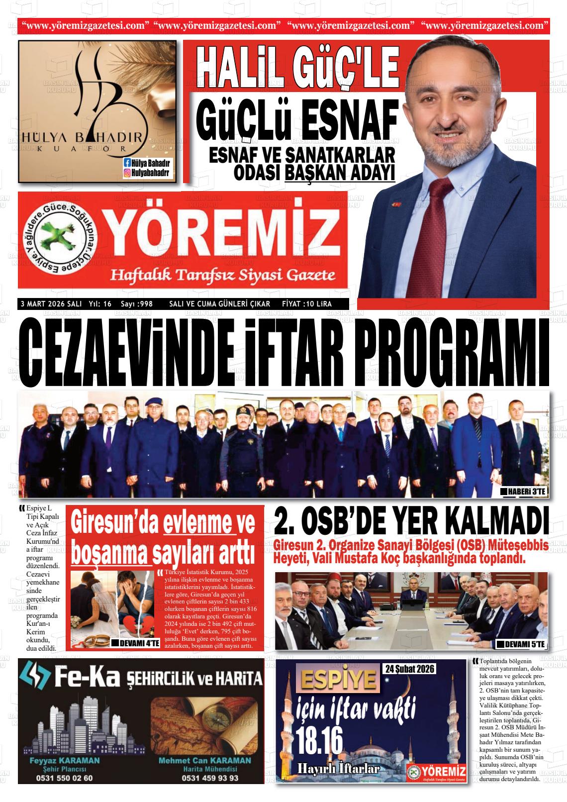 Gİresun Yerel Gazeteleri 03 Mart 2026, Salı Günü Manşeti