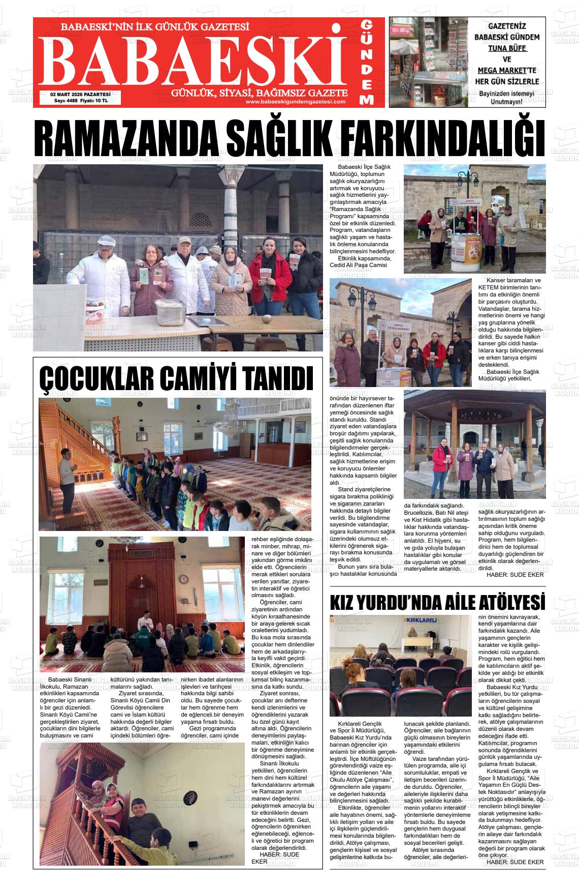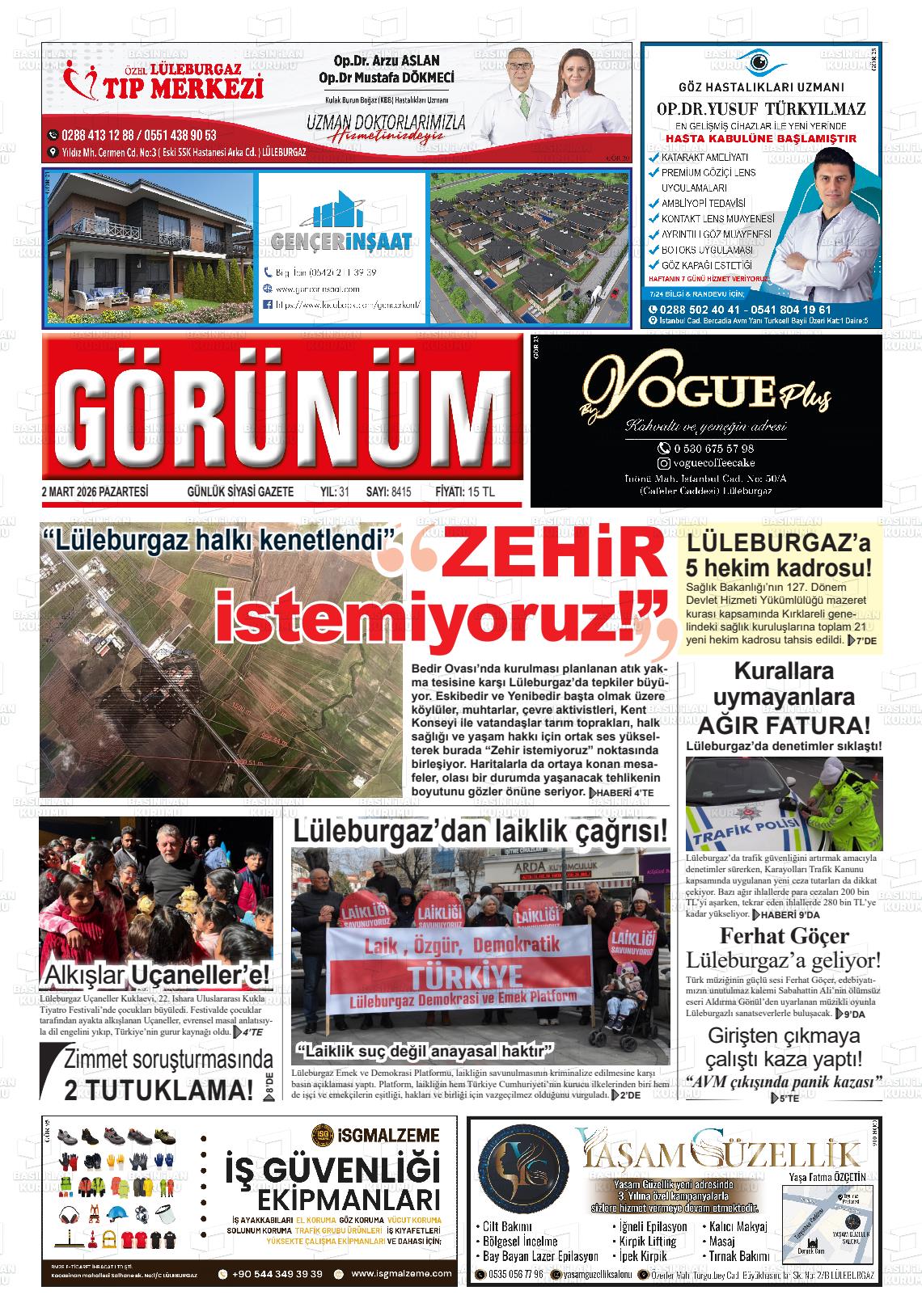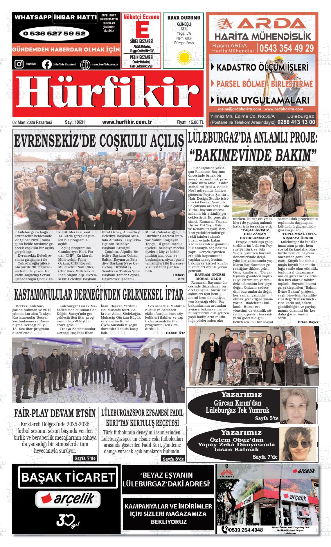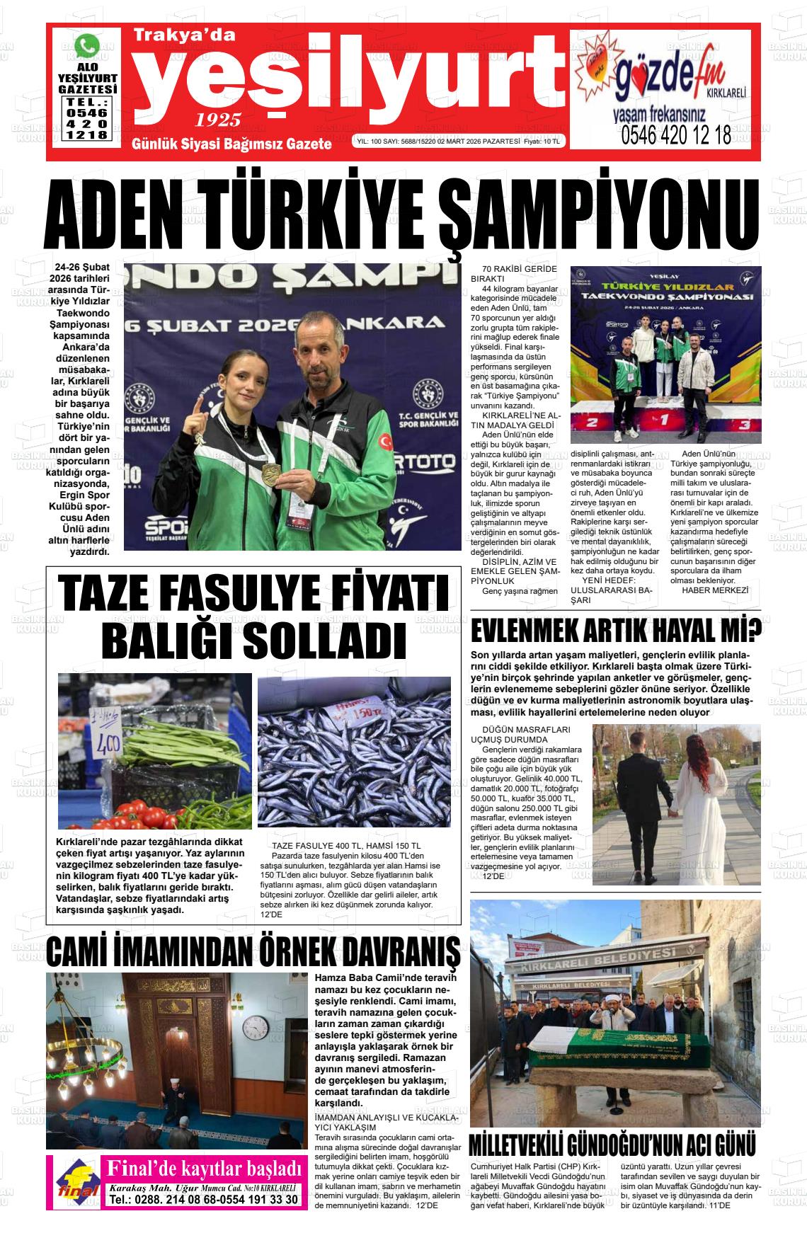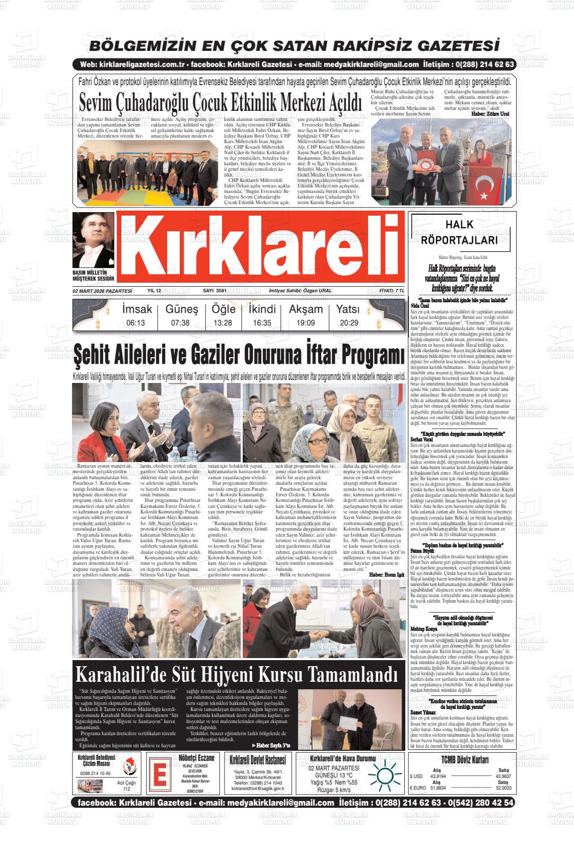Kırklarelİ Yerel Gazeteleri 02 Mart 2026, Pazartesi Günü Manşeti